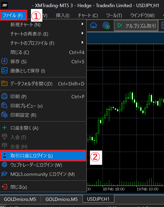 上部メニューから「ファイル」→「取引口座にログイン」