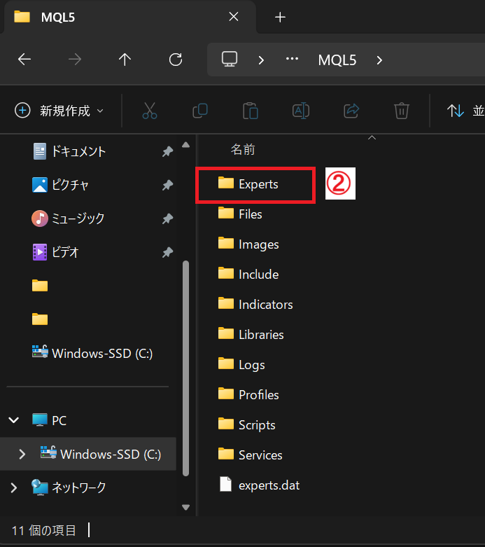 MQL5」→「Experts」フォルダを開き、